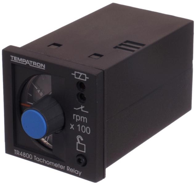 The Tempatron TR4800 tachometer relays are designed to monitor and control speed by energising the relay output when the monitored speed exceeds the setting on the user adjustable front dial. Three models are available to cover speeds from 5rpm to 10,000rpm. All models have an internal 15Vdc power supply for powering active sensors and a 0-1mA meter output for displaying the speed. The tachometer relays are housed in a compact DIN48 square enclosure which can either panel mount or surface/DIN rail mount to a socket and they are auxiliary powered from either 24Vac/dc or 110/230Vac. The 5 Amp rated single pole changeover relay output contact is isolated from the supply voltage and the relays have two LEDs to indicate both power and relay status.